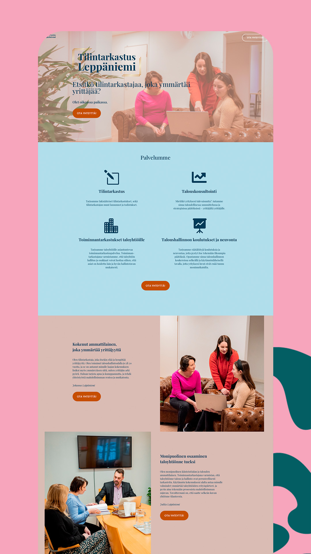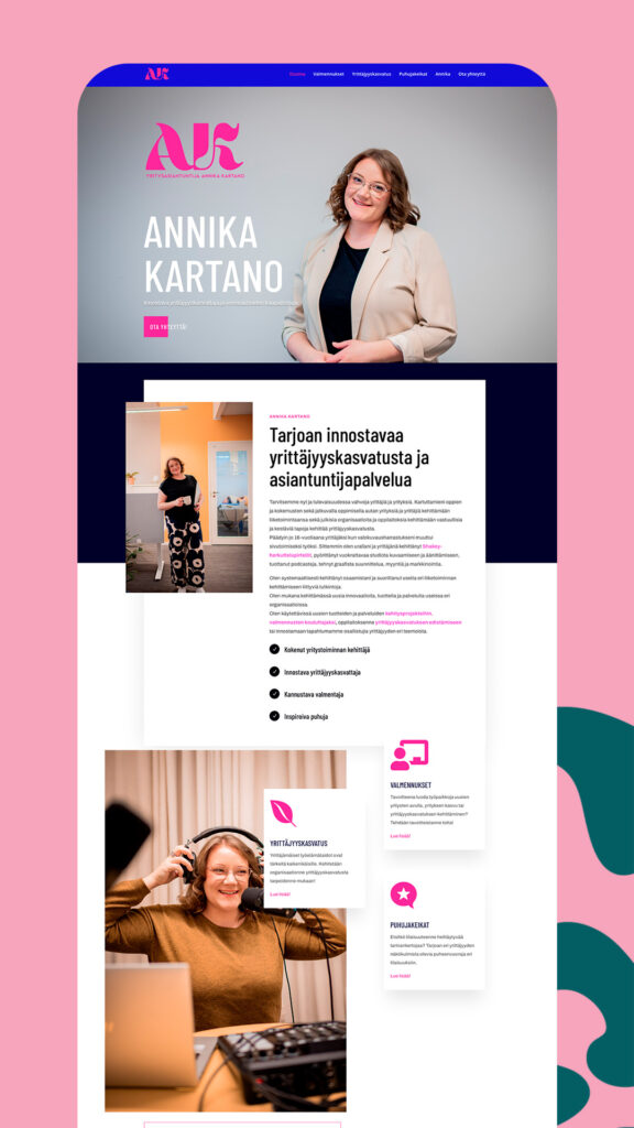 Vahvuutenani on kokonaisuuksien toteutus aina visuaalisesta ilmeestä verkkosivujen toteutukseen ja sosiaalisen median sisältöihin. Punainen lanka siis hyppysissä alusta loppuun asti!
